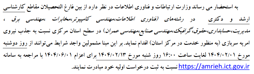 چهارمین مرحله جذب نیروی امریه سربازی در وزارت ارتباطات و فناوری اطلاعات ۲۷ فروردین ۱۴۰۴ | ۱۵:۱۱ کد : ۵۰۸۰۸ اطلاعیه ارسال به دیگران نام شما ایمیل شما ایمیل دریافتکننده ارسال انصراف تعداد بازدید:۴۲۳۲ فراخوان چهارمین مرحله جذب نیروی امریه سربازی در وزارت ارتباطات و فناوری اطلاعات