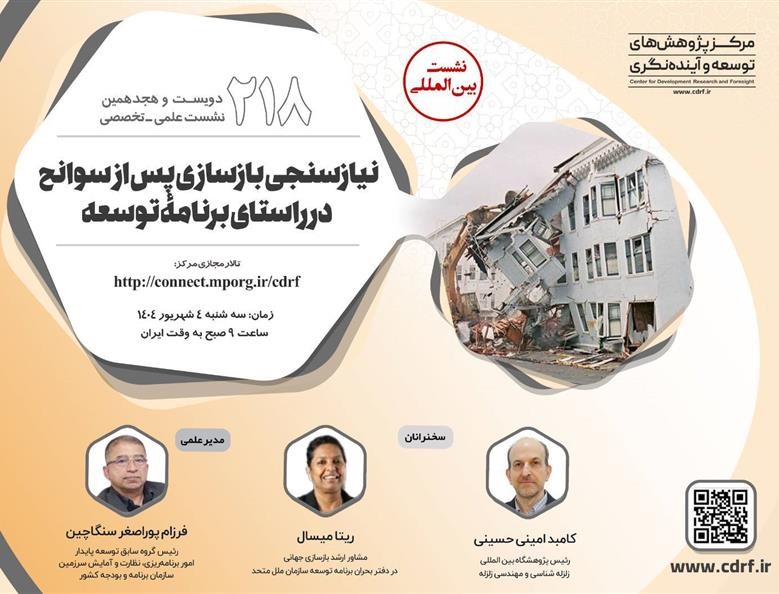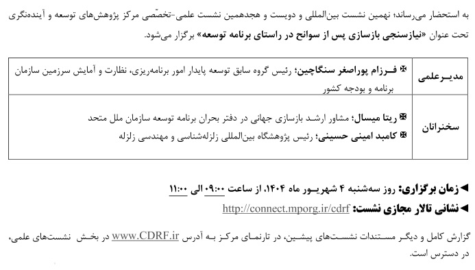 نشست علمی نیاز سنجی بازسازی سوانح در راستای برنامه توسعه ۰۳ شهریور ۱۴۰۴ | ۱۲:۳۷ کد : ۵۴۰۰۰ اطلاعیه ارسال به دیگران نام شما ایمیل شما ایمیل دریافتکننده ارسال انصراف تعداد بازدید:۱۵۸۴ نشست علمی نیاز سنجی بازسازی سوانح در راستای برنامه توسعه، توسط مرکز پژوهش های توسعه و آینده نگری برگزار می گردد.